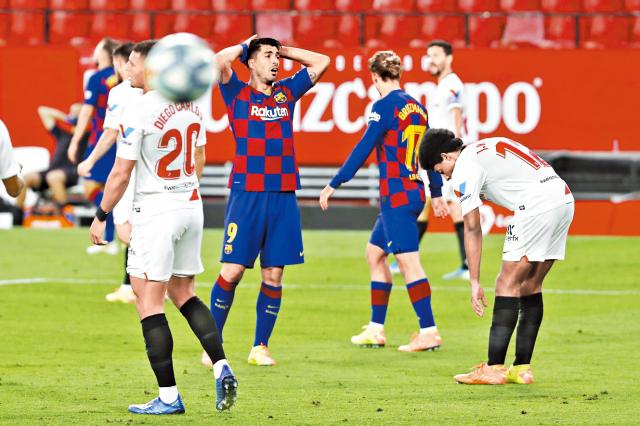 巴塞隆拿上周五在西甲聯賽,作客0:0悶和西維爾。復賽後首兩戰皆後備上陣的蘇亞雷斯(右)於今仗復任正選,與美斯及巴夫韋迪組成三箭頭,無奈各人腳頭無靈,巴塞最終只能與對手互交白卷,痛失兩分,榜首位置受動搖有機會被皇馬爬頭。