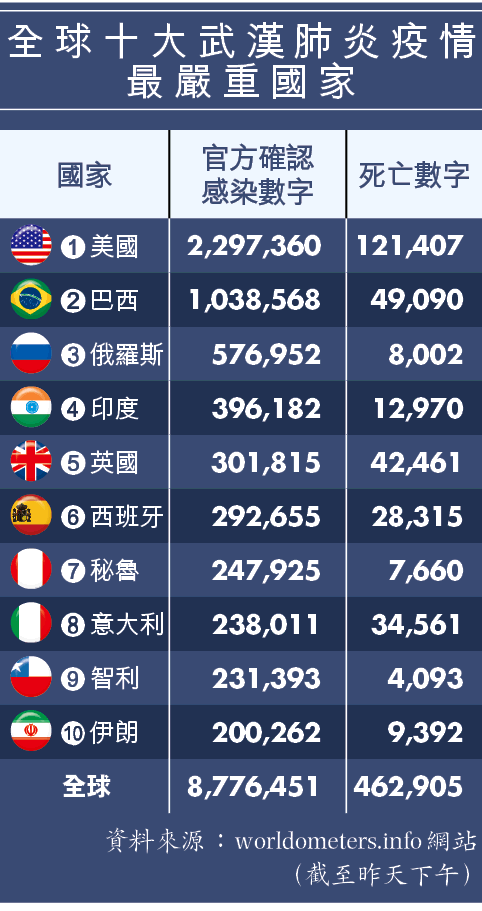 武漢肺炎疫情持續近半年,全球病例超過870萬宗,逾46萬人死亡;當中總統一直否定疫情的巴西,已破百萬病例,僅次美國,有研究更推斷8月入冬後該國染疫死亡人數會多過美國,達15萬人。世界衞生組織總幹事譚德塞警告,全球踏入「危險新階段」,呼籲大家繼續保持警惕和社交距離。