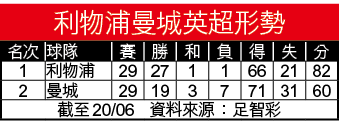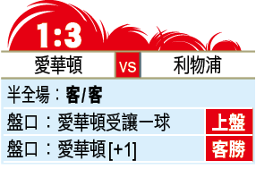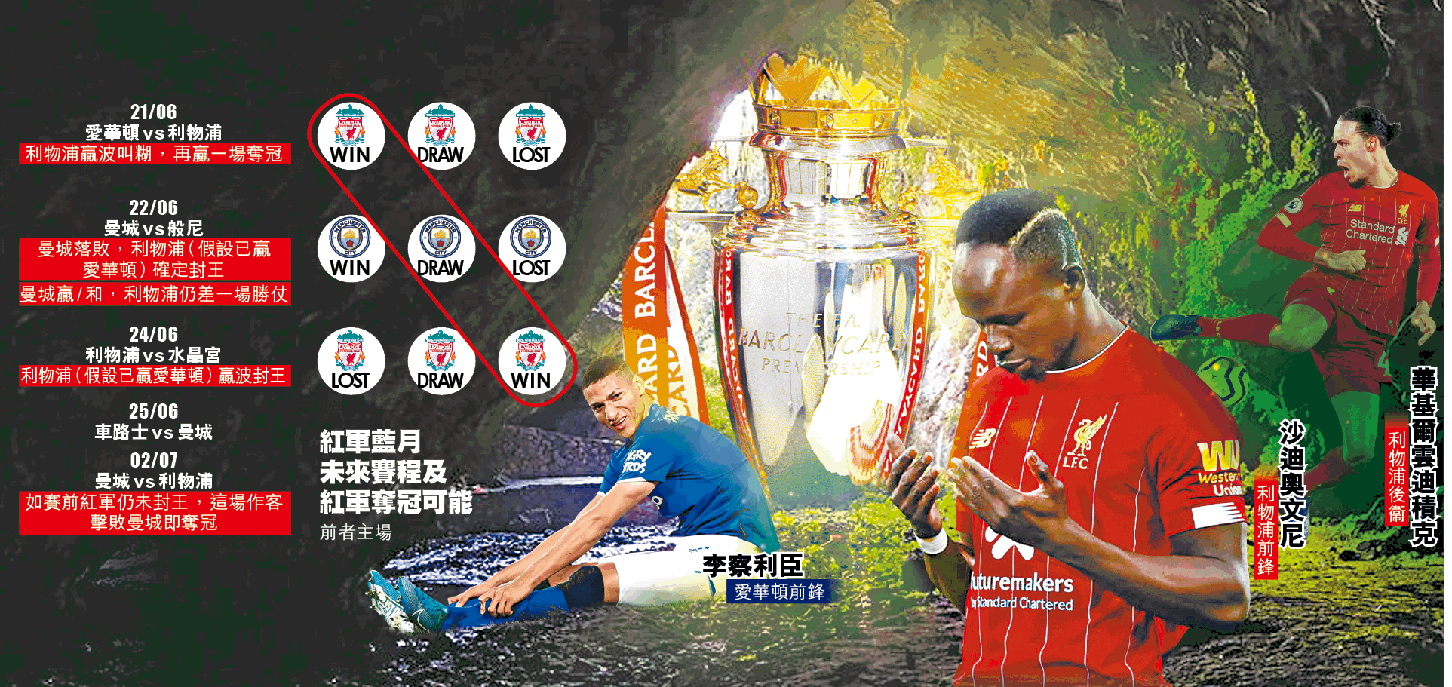 利物浦今季英超戰績誇張,直到3月初取得29戰27勝1和1負佳績,眼看球會終於一圓30年來首奪頂級聯賽冠軍宿願,卻受武漢肺炎疫情來襲令聯賽停擺。苦等逾三個月英超總算重開,唯一在數字上能威脅紅軍奪冠的曼城在首戰贏波,令紅軍要封王仍要多贏兩場,今場造訪愛華頓能贏波的話便正式叫糊。