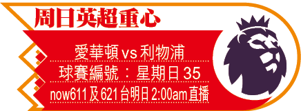 英超終於重開,榜首利物浦周日登場,在默西賽德打吡作客「拖肥糖」愛華頓。今季幾乎所向披靡的紅軍,距離首奪英超只差兩場勝仗,苦等逾百天後重返賽場,目標是要盡快完成任務,今場一眾主力皆可候命,強陣造訪葛迪遜公園球場勢奪三分叫糊,紅軍讓一球必捧上盤。