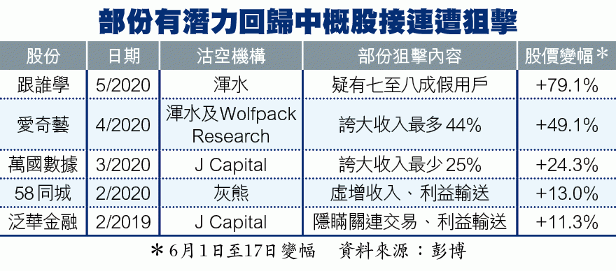 當中最受注目的,要數2月至今六度遭狙擊的線上教育股「跟誰學」,出手者包括沽空機構始祖渾水,上月曾質疑跟誰學七至八成用戶為「假用戶」;2月時另一沽空機構灰熊亦指其招生人數及收入誇大九倍。即使質素最受關注,但跟誰學在這波中概股爆升浪中,升勢是最凌厲一批,截至上周二止本月已狂飆65%,市值炒上千億元水平。