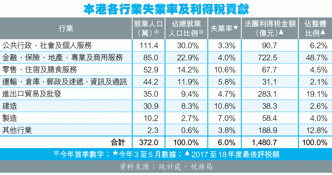 至於大家潛意識覺得零售酒店好賺好搵,三年前好景時只不過繳納不足70億元稅,佔比不足半成;連同建造及製造業,合共佔政府所收利得稅僅11%或164億元。