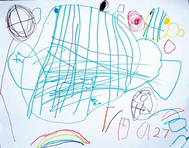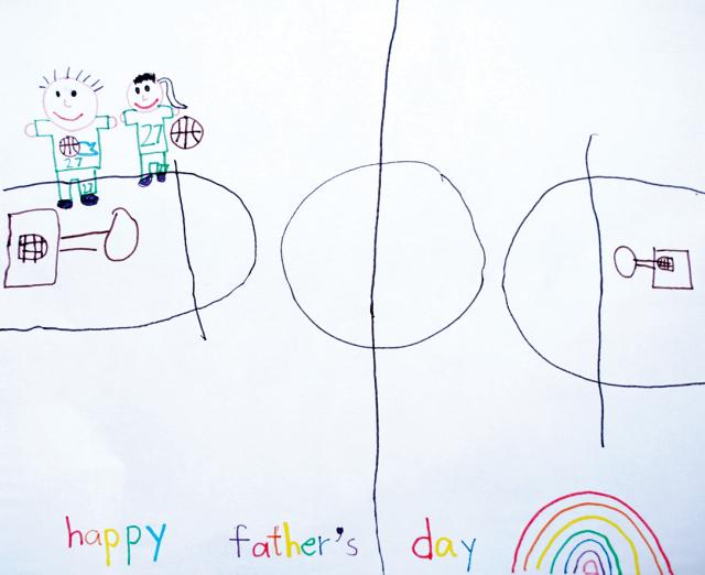 阿懃去夏從南華轉投滿貫,七歲的童童也相當醒目,在卡片畫上身穿綠色27號球衣的父親,阿懃不禁笑言:「幸好你知我轉了隊,沒有用紅色。」至於三歲的瑜瑜簡單直接,自己是魚,作為一家之主的阿懃便是最大的魚。