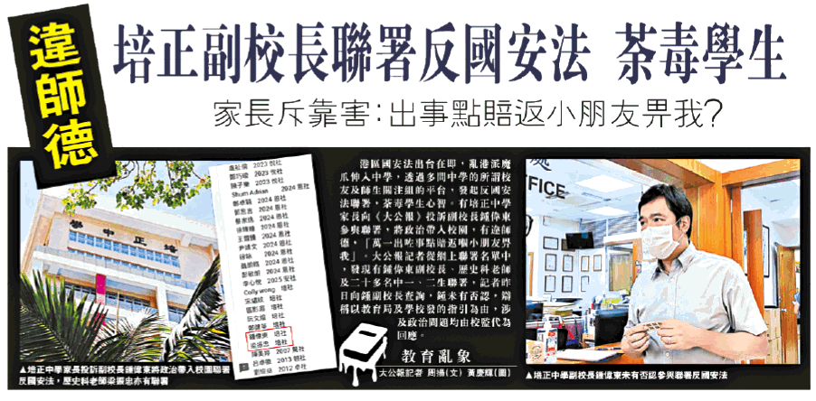 【本報訊】香港培正中學早前有師生及校友聯署反對港版國安法,有報道指當中兩人為該校教職員,其中一人更為副校長。校方周二在網上發聲明,強調學校是學生安心學習的地方,不容許學生受個人政見及政治爭拗影響,並稱會按教育局指引行事。教育局證實接獲投訴,已要求學校跟進、解釋及提交報告。教協批評當局打壓,強調聯署是和平表達意見的方式。