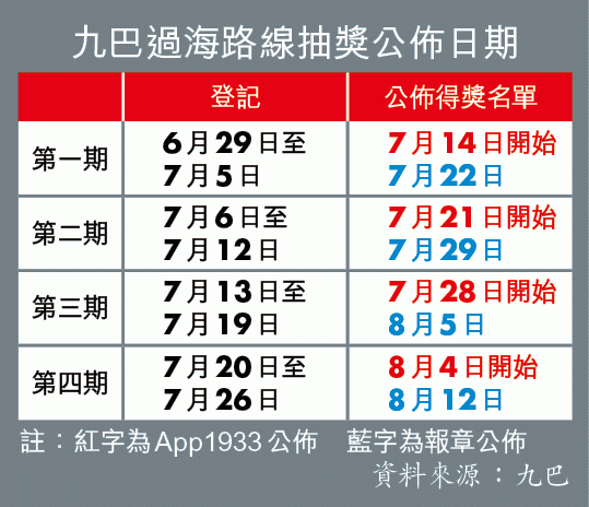 抽獎活動為期四星期,年滿18歲乘客可每星期透過九巴手機應用程式App1933,登記八達通號碼參與活動,並在該星期內使用有關八達通乘搭九巴營運之過海路線,如乘客在7月1日登記,所有在第一期,即6月29日至7月5日適用的旅程次數,會自動計算在內。