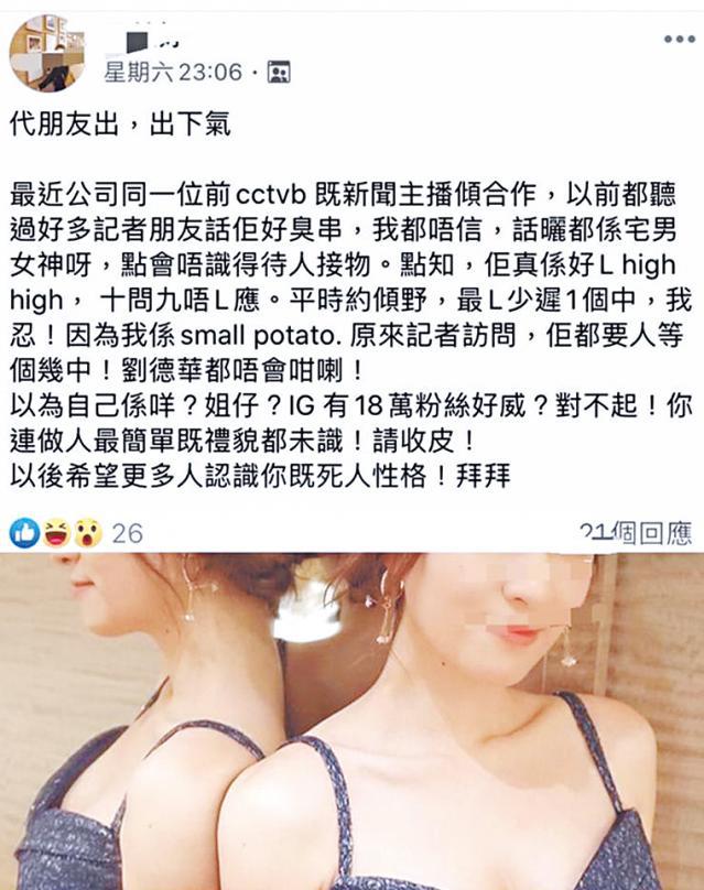 該貼文內容稱是代朋友發文:「最近公司同一位cctvb嘅新聞主播傾合作,以前都聽過好多記者朋友話佢好臭寸,我都唔信,話晒都係宅男女神呀,點會唔識得待人接物。點知……十問九唔應。平時約傾嘢,最X少遲1個鐘,我忍!因為我係small potato,原來記者訪問,佢都要人等個幾鐘!劉德華都唔會咁喇!以為自己係乜?姐仔?Ig有18萬粉絲好威?對不起!你連做人最簡單嘅禮貌都未識!請收皮!以後希望更多人認識你嘅死人性格!拜拜!」