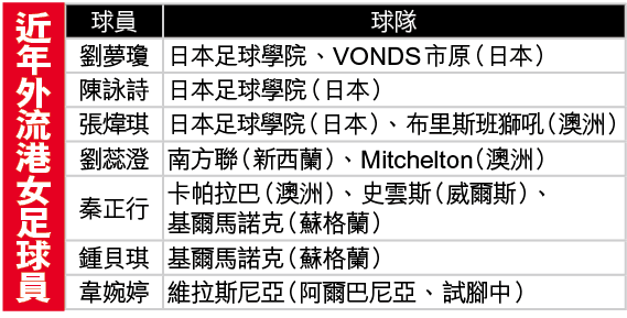 除了以上三人外,近年尚有中場劉蕊澄外流大洋洲,先後效力兩支次級聯賽球隊。秦正行亦曾效力澳洲次級聯賽球隊卡帕拉巴,其後轉投威爾斯的史雲斯,現效力蘇格蘭的基爾馬諾克,另一港將鍾貝琪是她的隊友。最近韋婉婷亦到阿爾巴尼亞球隊維拉斯尼亞試腳並上陣兩次,若成功留效,來季有望戰女子歐聯。