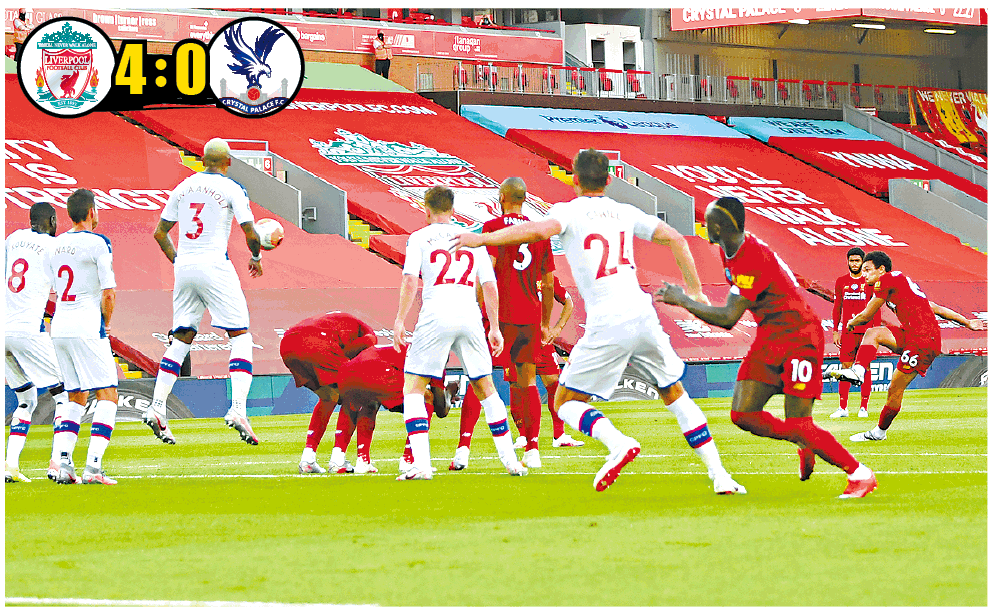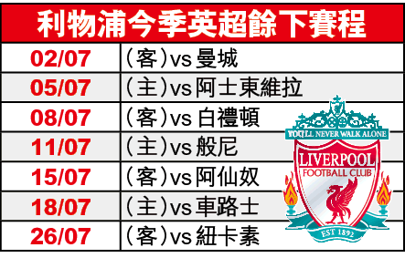 或者因與停擺前的正式賽事已相隔三個月時間,利物浦在對愛華頓一仗,全部球員似未入局,加上對方在「大師」安察洛堤領軍下防線穩固,結果只能0:0收場,令不少期待他們已久的紅軍球迷失望而回。不過周三對水晶宮一仗,那支攻力驚人的紅軍回來了,踢至23分鐘已由阿歷山大阿諾特射入罰球打開缺口,踢至完半場前,再有穆罕默德沙拿接應法賓奴泰華利斯的長傳入楔,控定皮球後挑過門將射成2:0;55分鐘,輪到上半場助攻的法賓奴,以一腳30碼遠射轟破對手大門,69分鐘,沙拿再助攻沙迪奧文尼單刀埋齋,每人各入一球下輕鬆獲勝。