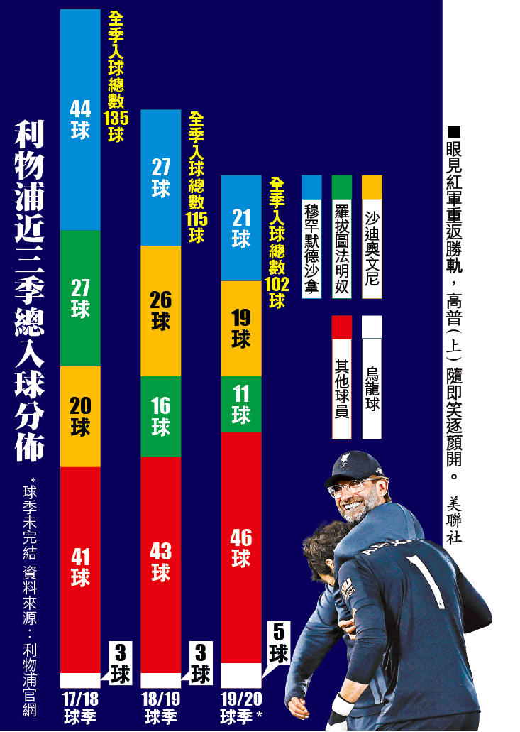 周日英超復賽首戰在默郡打吡與愛華頓演0:0悶戰的利物浦,三天後的比賽重燃火力,回到晏菲路主場以4:0大勝水晶宮,今季各項賽事入球總數已達102球,連續三季破百,足證他們為何近幾年能被盛讚是全歐洲火力最強的其中一隊球隊。