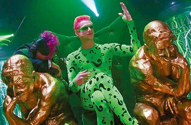 《蝙蝠俠:不敗之謎》的確好colourful,不只葛咸城,還有雙面人、謎妖,就連一般在街頭搵食的三流gangster,都不約而同擁抱五顏六色花喱花碌的時裝世界,成齣戲最keep到個黑tone的,不是蝙蝠俠,而是妮歌潔曼(Nicole Kidman)的媚博士,永遠穿上一條黑色貼身低胸裙。在這麼colourful的葛咸城裏,蝙蝠俠的打鬥也熱熱鬧鬧,每每以最炫目最誇張的方式去處理危機(頭場與雙面人的對決尤其明顯),恍如變成一連串旨在提供奇觀的馬戲表演,所謂危機,只是一種營造緊張刺激的掩眼法。但不好睇嗎?絕對不是,而且好好睇,不然我也不會入戲院睇兩次。