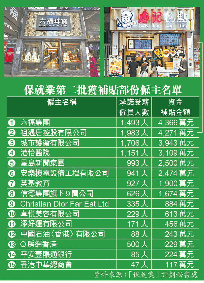 保就業計劃秘書處指出,第二批僱主名單涉33,679名僱主,當中98%為聘請不足50名僱員的中小微企,涉補貼約65億元,僱主承諾補貼期內維持超過28萬名受薪僱員。獲得最多補貼的是六福集團,涉1,493名員工共獲4,366萬元資助;經營唐記包點的祖遇唐控股有限公司則獲4,271萬元。