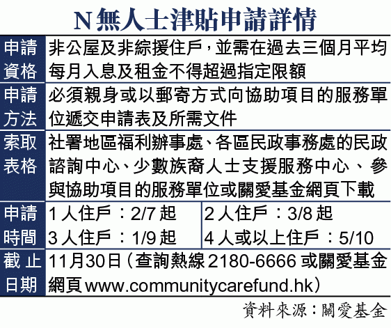 關愛基金專責小組昨公佈,今次發放的N無津貼,一人住戶為4,500元、二人家庭9,000元、三人住戶12,500元、四人住戶14,500元,至於五人或以上住戶則為15,500元,申請者有入息及租金限制。當局預留超過11億元推行該項目,預計10.5萬戶共約27.2萬人受惠。今次項目行政費為1.7億元。