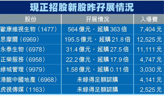 熾熱氣氛下,緊接登場的新股認購反應熱烈,截至昨晚,七隻首日招股的新股已凍資800多億元。市場焦點歐康維視生物獨佔鰲頭,孖展額暫錄564億元,超購363倍。已有盈利的電子煙概念股思摩爾國際(6969)亦有195.5億元孖展,超購21.8倍。永泰生物(6978)表現不俗,暫錄31.4億元孖展,超購27.5倍。