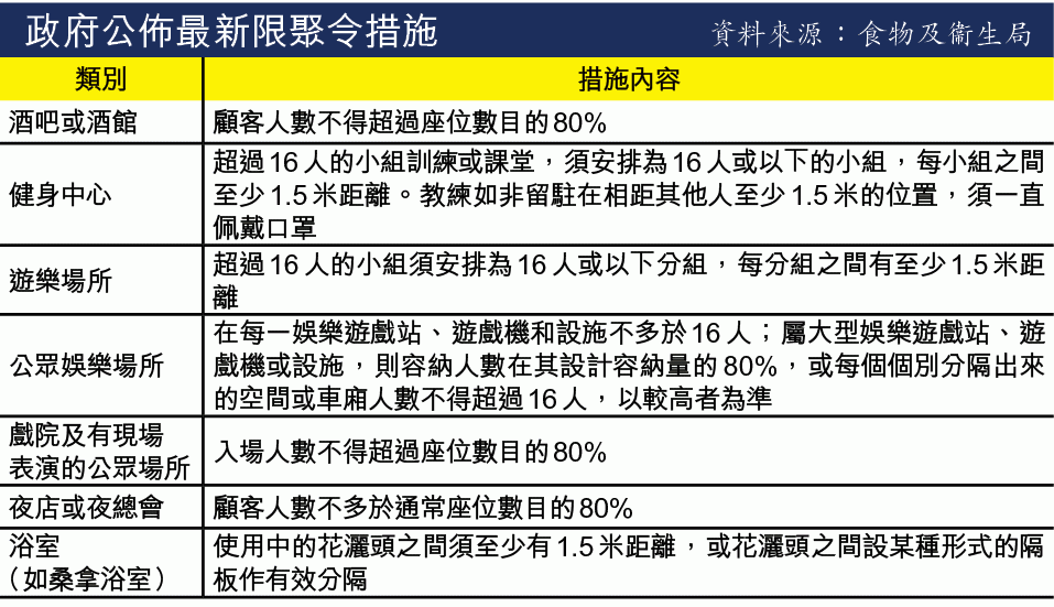 政府宣佈公眾地方群組聚集人數上限保持50人,但宗教活動參加人數將放寬至處所可容納人數八成;酒吧或酒館、公眾娛樂場所的大型娛樂遊戲站、電影院、夜店或夜總會等的人數限制亦增至八成。新措施7月3日生效,直至7月16日。因應粵港澳三地即將通關,政府宣佈延長第599C章《若干到港人士強制檢疫規例》至8月7日,以便有法例框架實施後的過境安排。