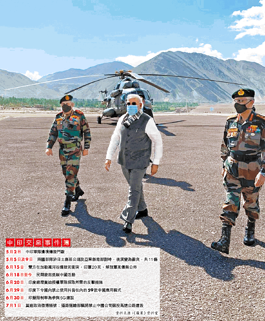 中印自上月初邊境爆致命衝突後,兩國在民間、經濟,甚至在軍事調配上都互相敵視。印度總理莫迪昨早突然到訪印度邊境城市Nimu,並向駐軍稱:「敵人已看到你們的怒火。」他不點名警告中國:「霸權時代已結束,一些國家的擴張主義行為已危及世界和平。」印度國防部日前還緊急向俄羅斯提交了一份軍火採購清單,總值超過10億美元(約78億港元),大部份是坦克及裝甲武器。