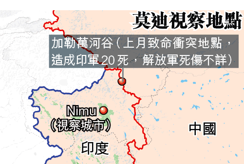 莫迪昨早在沒有事先通知下,突然到訪列城附近城市Nimu的軍事基地,是自五月起中印爆發衝突以來,軍方最高層首次抵達邊境城市。莫迪向印度第14軍發表講話,提升士氣。他說:「第14軍的勇氣將會在世界所有的地方提及,14軍的事迹亦已家喻戶曉。」