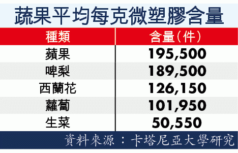 意大利卡塔尼亞大學早前進行研究,檢驗從超市及街市購入的多款蔬果,結果發現全部均含有微塑膠,當中蘋果被驗出含有最多微塑膠,每克平均含有195,500件,梨亦被驗出平均每克含有189,500件微塑膠;蔬菜方面,西蘭花及蘿蔔每克平均亦含有超過10萬件微塑膠。