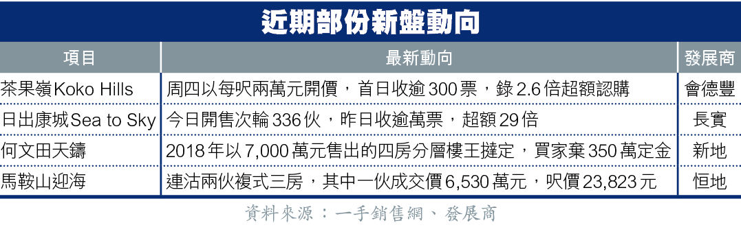 另外,長實(1113)將軍澳日出康城新盤Sea to Sky今日次輪銷售336伙,昨日下午截止登記。市場消息指出,項目至今累積收票過萬,以336伙計,超額認購逾29倍。Sea to Sky上周末首批開售462伙,即日沽出456伙後,佔比99%,隨即連環加推兩張價單,涉及336伙,折實售價653.8萬元至2,011.2萬元,呎價13,906元至18,818元。
