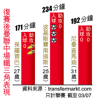 曼聯復賽後四戰仍未嘗敗仗,除了得益於鋒線上球員入球外,由保羅普巴、波基斯費南迪斯(B費)以及尼曼查馬迪組成的中場鐵三角,同樣功不可沒。現時馬迪在中場的任務主要在防守端作貢獻,令到普巴以及B費可以全心全意投入進攻,相信蘇斯克查就是看中這一點,才令馬迪得以穩佔陣中正選位置。
