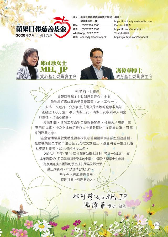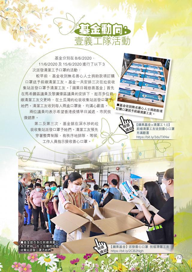 較早前,基金收到無名善心人士捐助款項訂購口罩送予前線清潔工友。基金一共安排三次在垃圾收集站派發口罩予清潔工友。「蘋果日報慈善基金」首先在馬希鵬區議員及黎廣偉區議員的安排下,趁百多位前線清潔工友交更時,在土瓜灣的垃圾收集站派發口罩予她們。清潔工友收到每人兩盒口罩後,均滿心歡喜。