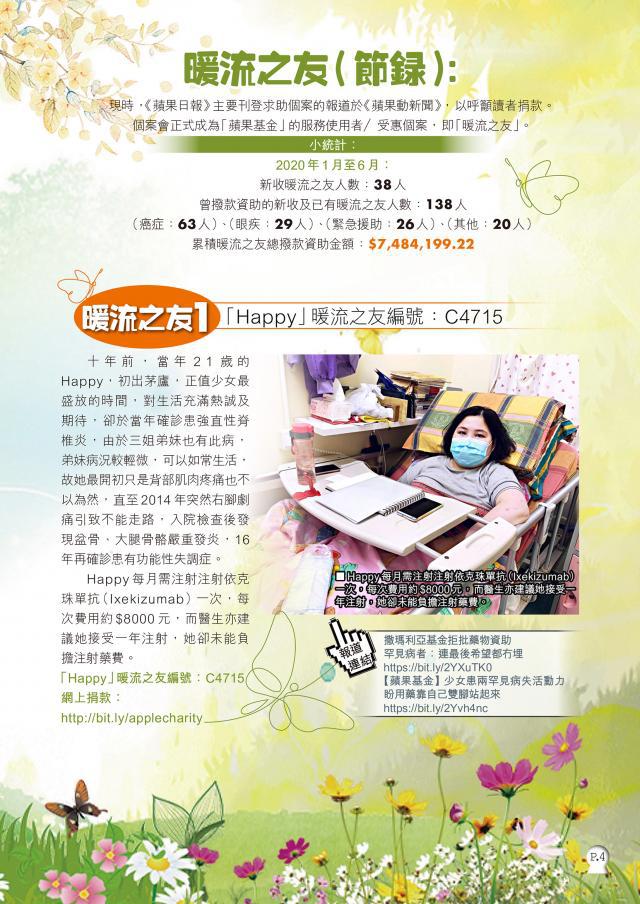 十年前,當年21歲的Happy,初出茅廬,正值少女最盛放的時間,對生活充滿熱誠及期待,卻於當年確診患強直性脊椎炎,由於三姐弟妹也有此病,弟妹病況較輕微,可以如常生活,故她最開初只是背部肌肉疼痛也不以為然,直至2014年突然右腳劇痛引致不能走路,入院檢查後發現盆骨、大腿骨骼嚴重發炎,16年再確診患有功能性失調症。