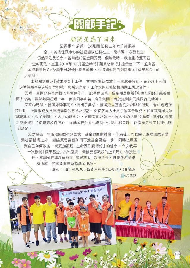 記得兩年前第一次離開任職三年的「蘋果基金」,其後往深水埗的社福機構任職社工一段時間,我對基金仍然關注及想念,當時處於基金開展另一個階段時,我也重拾返回基金的衝勁。直至2018年12月基金舉行「蘋果慈善行」擔任義工下,並向基金總幹事周Sir及蘋果日報張社長自薦後,並得到他們的邀請重返「蘋果基金」的大家庭。