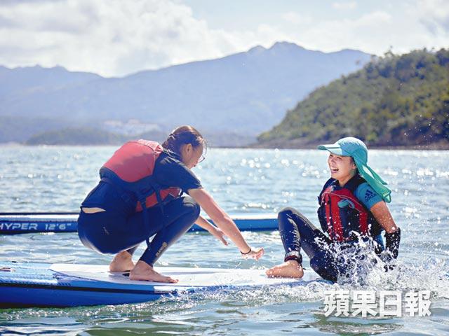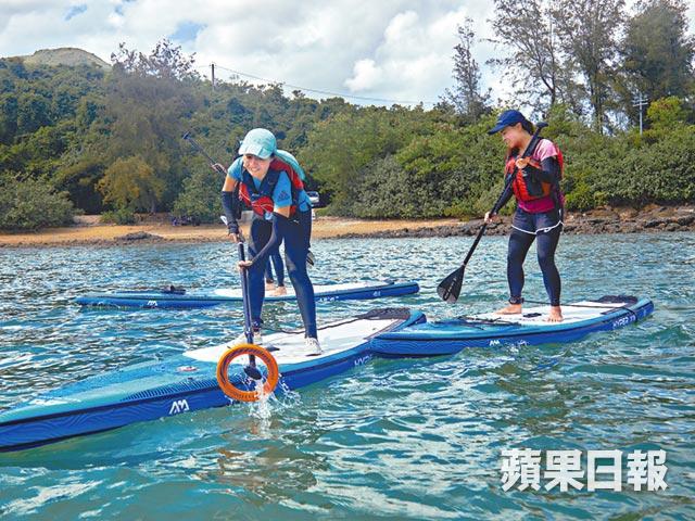 兩小時的直立板初級課程,首要是培訓安全意識,腳眼繫上安全繩、穿起坐浮衣。玩直立板一般有伏、跪、企三個姿勢,跪姿看起來最優雅;企姿,手腰腳發力要好,不過同時最考初學者的平衡能力。面向前方,腳微微彎曲,男士通常平衡力不太好,一開始很容易跌落水。記者初次站上直立板,有一種君臨天下的感覺,當然是腳震版本,就算岸邊有浪湧至亦不至於跌入水中。至於轉彎方面,是透過一前加一後槳。假設你要轉右,先划一下左前槳再加一下後槳就完成。初學者需要掌握划槳的力度以及入水深度,假如不幸掉下水,盡量向後傾斜,以背部入水。