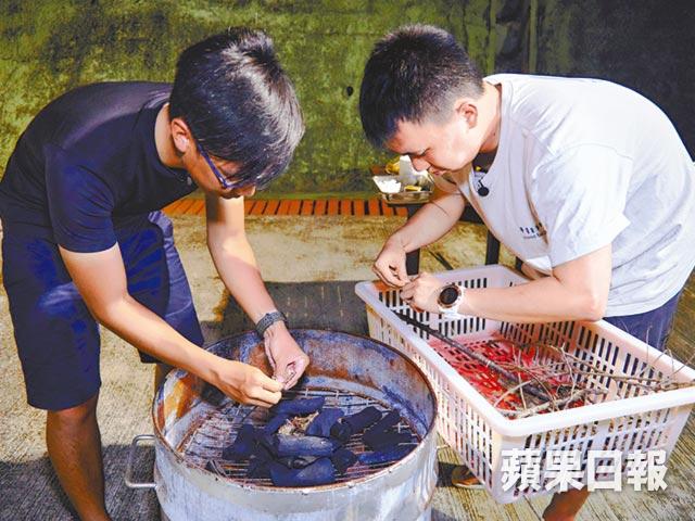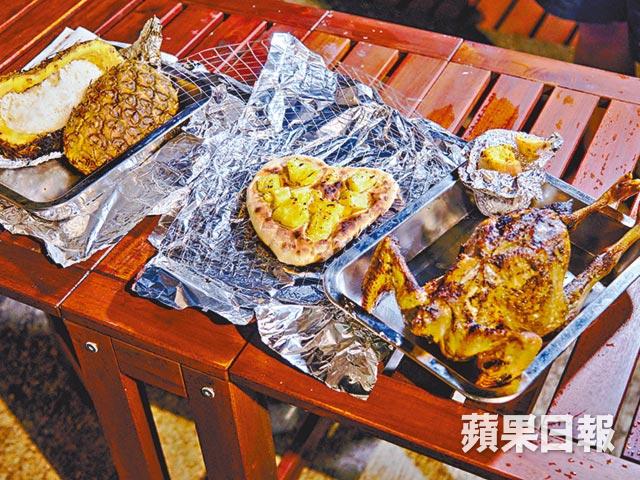 玩完一輪直立板後,就開始體驗原野烹飪($250一次)。沒有煤氣爐頭,用僅餘的物資,如炭、枯枝或錫紙生火煮食。Cadman給我三根火柴燃點炭火,再去執枯枝及落葉,但不要使用剛掉下的綠葉,因為充滿水份難以點燃。原野烹飪食物包括菠蘿焗飯、原野pizza、竹烤雞等。製作pizza難度最高,徒手搓麵粉加水便成麵糰,沒有比例沒有食譜,一切隨心便是原野烹飪終極奧妙之處。把新鮮菠蘿起肉,加水加飯包錫紙焗製,形成天然無加工的菠蘿焗飯。竹烤雞像燒雞翼一樣,直接用竹十字形將雞叉起來,由於竹容易燒斷 ,需要多加兩支叉。原野烹飪講求天然樸素,食物沒有添加調味料,味道相對清淡,不過以記者第一次搓麵粉,合格有餘吧!
