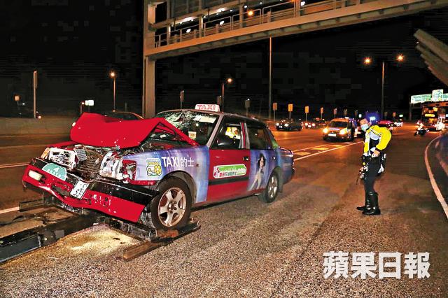 的士意外後車頭摺起,擋風玻璃碎裂,夫婦受傷被困車廂內,男司機沒有受傷,自行走出車廂報警。消防到場救起夫婦送院,男司機被拘捕帶署暫准保釋候查,本月下旬向警方報到。