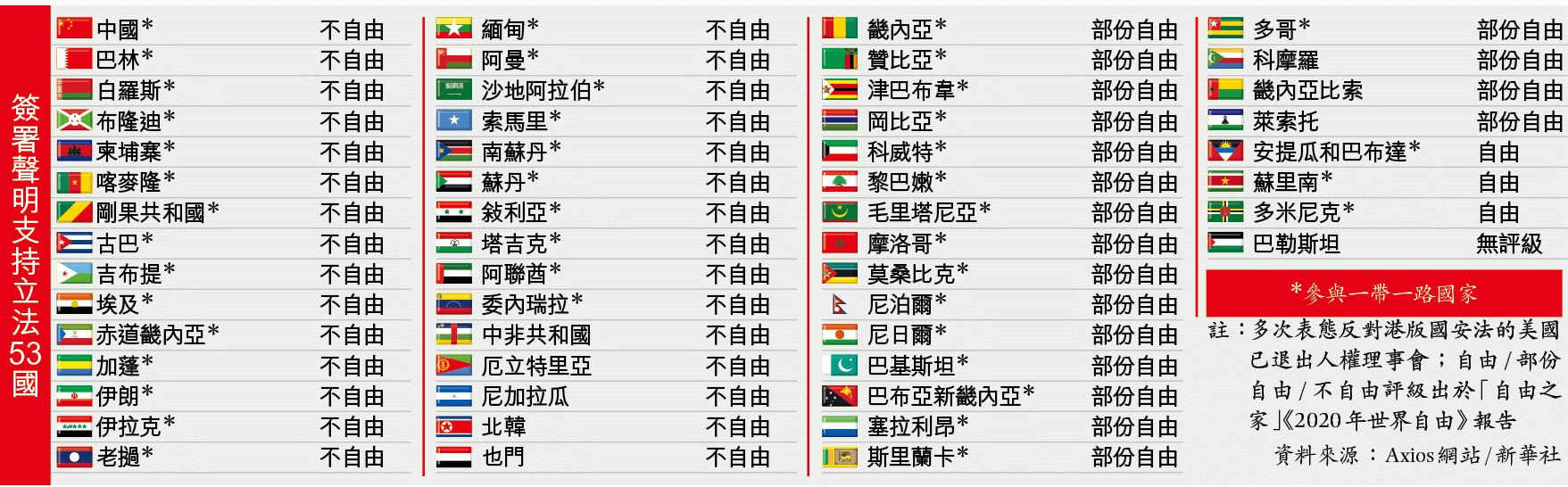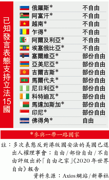 但據Axios網站披露聯署聲明兩大陣營的名單,支持國安法53國中,有44個是一帶一路參與國,30國被美國非政府組織「自由之家」評為「不自由」、19國評為「部份自由」,只有三國被評為「自由」國家,巴勒斯坦沒有評級。新華社報道提及的撐國安法國家有15個,全是一帶一路參與國,當中六個被評「不自由」、八個「部份自由」,只有一個「自由」。