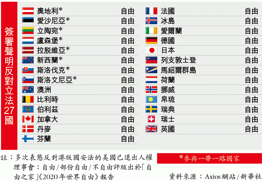相反,聯署反對國安法的27國,都被評是「自由」國家,當中奧地利、新西蘭等八國雖有參與一帶一路,仍為香港仗義執言。