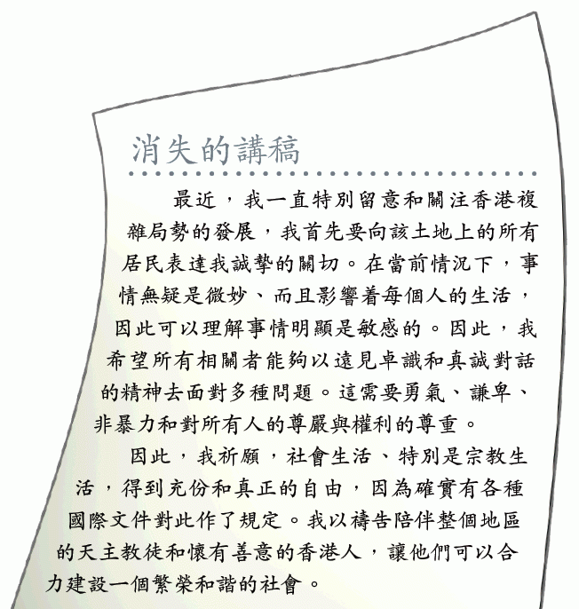 根據本報取得的嚴禁發佈(embargo)公告,教宗臨時抽起的段落表示,他一直留意香港複雜局勢的發展,並向港人表達他關切。他指出,事件影響着每個人的生活,因此他希望相關各方能夠真誠對話。