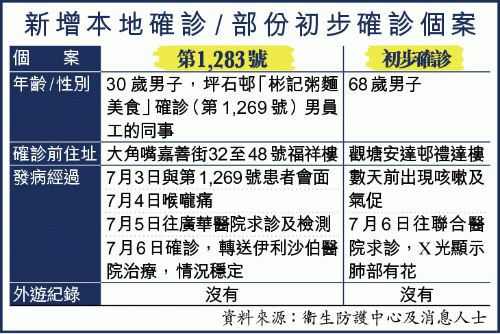 據悉昨新增的八宗初步確診,部份未知是否屬本地個案。其中兩宗為28歲在旺角食肆工作男子,以及85歲慈雲山港泰護老中心女院友。另一名居於觀塘安達邨禮達樓的68歲男患者無外遊紀錄,感染源頭未明。本報記者昨到安達邨視察,發現並未消毒及清潔,大廈保安員稱需待衞生署確認後才清潔。