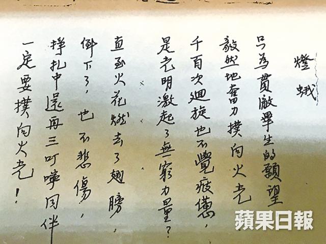 但更值得的細看的,卻是屋內展覽的各幀珍貴照片,以及尤其是殷的各份珍貴手稿,如他親筆書寫的〈我被迫離開台灣大學的經過〉,以及他所作的那首著名新詩〈燈蛾〉(見圖9)等。