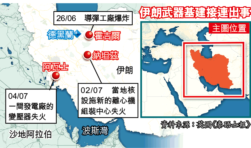 伊朗多地的軍事設施、核設施和基建,近日接連出事,疑涉外國破壞行動。伊朗淡化上周納坦茲核設施失火事件後,前天改口確認是新的離心機組裝中心出事,承認提煉濃縮鈾活動受到打擊。而在官員揚言報復之際,伊朗革命衞隊宣佈在波斯灣沿岸有多個「地下導彈城」。