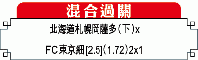 另一場重頭戲是FC東京對川崎前鋒的多摩川打吡,兩軍上輪比賽均全取三分,不過東京的巴西前鋒迪亞高奧利華拉上仗傷出,今場或會被安排休息,對球隊攻力影響甚大;另邊廂川崎兩位老將小林悠和中村憲剛亦很大機會繼續倦勤,而且球隊平均年齡較高,表現或會受頻密賽程影響,今場而敲入球中位數[2.5球]的「細」。(球賽編號:星期三8;有線662台今日6:30pm直播)