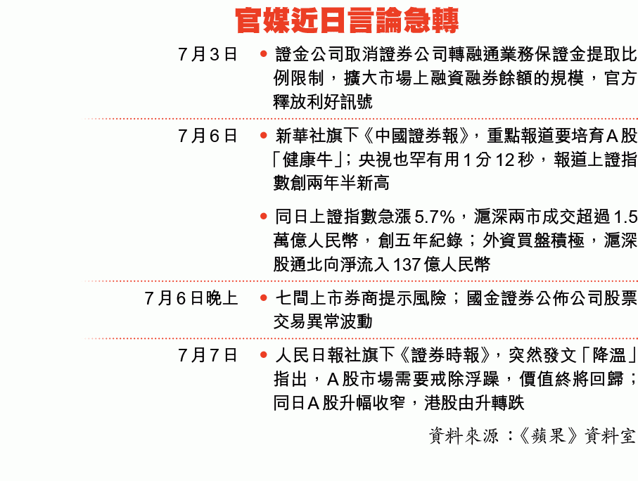 不過,人民日報社旗下《證券時報》為怕「股瘋」再來,昨急為股市降溫,指內地整體經濟仍然較為困難、企業盈利增長乏力,概念炒作過甚。文章指A股市場有需要戒除浮躁,規避風險;又特別提到,「切不可在市場熱潮中迷失自我,重犯幾年前錯誤」。提醒散戶不要好了傷疤忘了痛,要放棄一夜暴富心態。