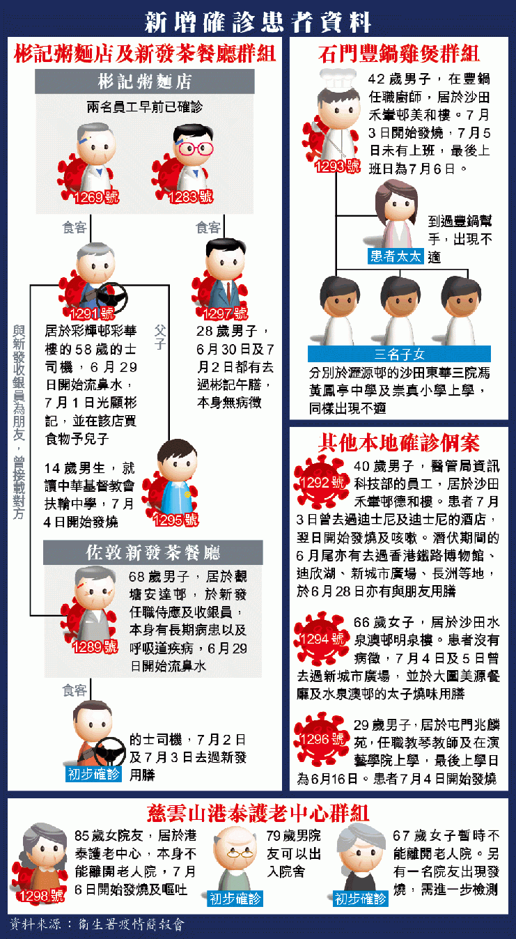 1293號個案是一名沙田石門京瑞廣場一期豐鍋雞煲任職廚師的42歲男子;1294號個案是居於沙田水泉澳邨明泉樓66歲女子,患者沒有病徵,檢查時有照肺部CT,發現有問題後再去看私家醫生,留下深喉唾液樣本後確診。患者7月4日及5日曾去過新城市廣場,並於大圍美源餐廳及水泉澳邨的太子燒味用膳。另亦出現全港首宗安老院舍個案。