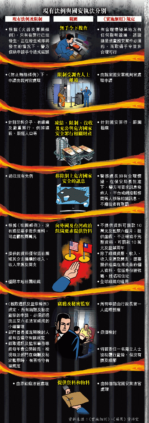 香港大學法律學院首席講師張達明昨接受電台訪問時指,政府公佈《實施細則》繞過立法會,公眾完全沒有機會討論,條文更完全摒除法庭把關角色,形容根據香港過往多年立法程序,會由律政司基本法科及人權科蓋印確認草案符合基本人權保障,惟今次立法方式完全不同,變相授予執法機關極大權力,「基本上係冇王管」。