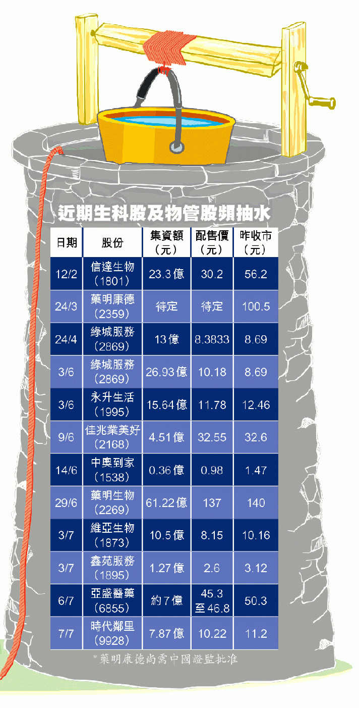 最新一隻配股的生科股為亞盛醫藥(6855),前日配售集資7億元。按統計今年配售完成的生科概念股已有4隻,「抽水」逾百億元。包括信達生物(1801)在2月配售集資23.3億元,其後隨着疫情爆發,配售有所減少,但最近兩星期風潮再起,包括藥明生物(2269)於上星期一(6月29日)集資61.22億元、維亞生物(1873)在上周五集資10.5億元。藥明生物姊妹公司藥明康德(2359),亦在3月已準備逾2億股的A股及H股配售,目前正待中國證監會批准,如配售正式落實,以昨日收市價100.5元計算,估計集資逾200億元,將成為今年最大的生科股新股集資。