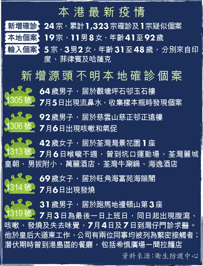 【本報訊】本港昨新增24宗武漢肺炎確診個案,19宗為本地感染,當中五宗源頭不明。食肆和安老院舍群組均有新增個案,有立法會議員憂慮本港將出現大規模爆發,批評林鄭政府至今未有相應措施;有專家形容,香港現時疫情是「小小遍地開花,情況不樂觀」,群組或已出現第四代傳播,促政府盡快收緊社交距離措施,包括食肆每張枱最多坐四人。衞生防護中心承認本港近日多宗確診個案源頭不明,憂未來感染人數以倍數激增。