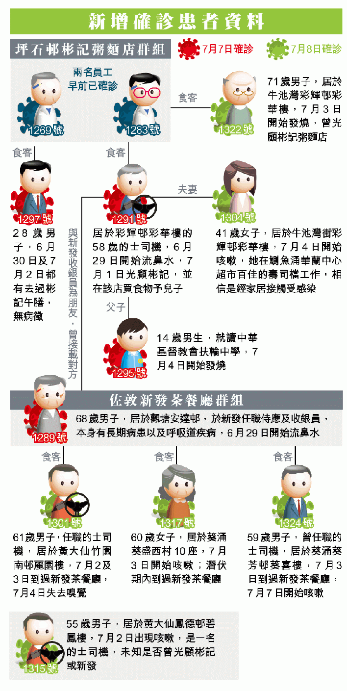 另一名確診的士司機是第1301號61歲男子,7月2及3日到過新發,7月4日失去嗅覺。第1324號為59歲男子,曾任職的士司機,7月3日到過新發,7月7日開始咳嗽。群組還包括第1317號60歲女子,潛伏期內到過新發,7月3日開始咳嗽;第1322號71歲男子曾到過彬記,確實日子需要再確認,7月3日發燒。