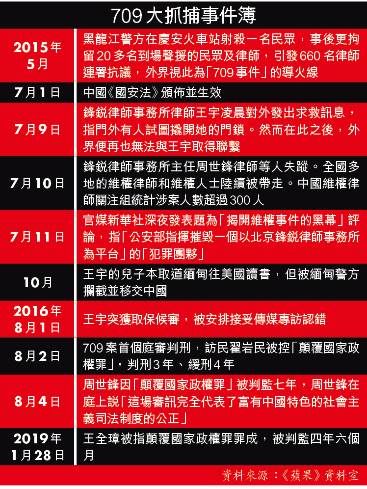 「突然斷電了,接着WiFi斷了,然後就聽到有人撬門的聲音……我先生和兒子的電話都處於無人接聽狀態,他們現在到底怎麼樣了?有甚麼事衝我來!」北京鋒銳律師事務所人權律師王宇2015年7月9日向外發放了這個訊息,展開了709事件的序幕。全中國過百名維權人士、人權律師被傳喚、被追捕。