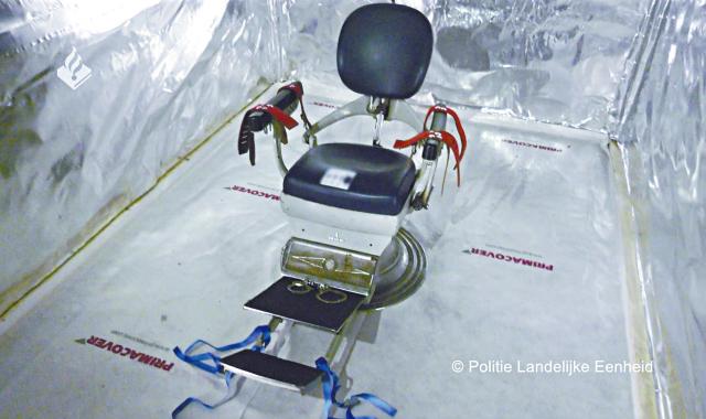 荷蘭警方前日指,發現有人把貨櫃改裝成隔音的「酷刑密室」,內置一張牙科椅和剪草刀、老虎鉗、手術刀和手銬等工具,已拘捕六名男子。