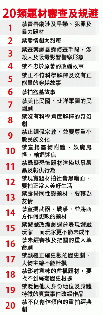根據廣電總局發出的「20類題材審查及規避」指引,以後拍愛情題材也不能太甜蜜,就算青春劇也禁拍早戀、犯罪和暴力故事,連同性戀亦要點到為止,最後轉化為友情,而遊戲改編題材,不能太過表現遊戲玩家,而玩家更不能是未成年,的確很違反人性。難怪有內地網友看完20條限制內容後,反應強烈說:「都別拍算了!」、「同性戀轉友情很離譜」、「想看甜甜的無腦戀愛也不行」。其實未有明文規定該條款前,不少電影已先作自我審查,如去年周冬雨主演的《少年的你》,於今屆香港電影金像獎橫掃8個大獎,但於內地審批時就要改結局、經歷一波三折才面世。