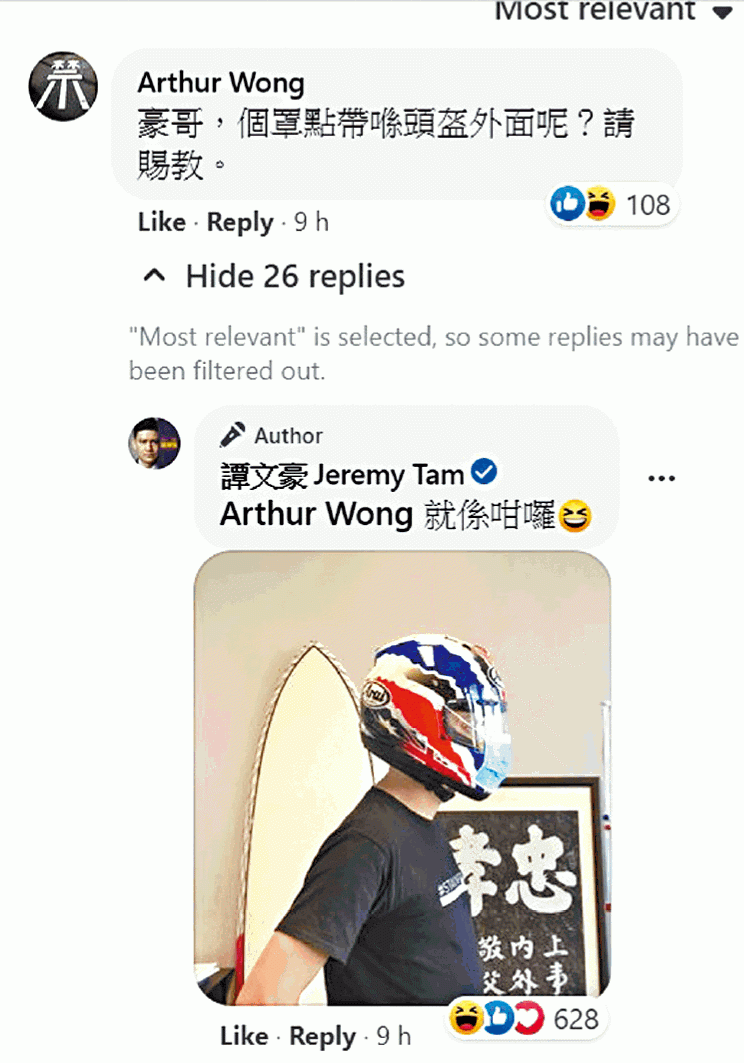 本身揸開飛機嘅公民黨譚文豪(Jeremy),噚日喺fb貼咗啲相,改用一個揸烈火戰車造型、喺電單車頭盔外面加個口罩,咁唔係貪型,亦唔係想幫政府呼籲大家戴口罩,而係喺政府新戴罩要求下,揸住架私家車、電單車喺路上行駛,一定處身公眾地方,但電單車司機要唔要戴口罩就無人講過,佢亦專登問過食衞局,結果就係無結果。