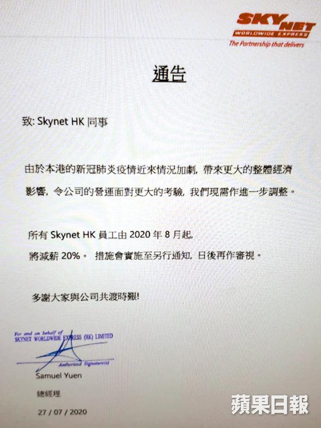 有「Skynet國際快遞」的在職員工稱,上月底公司發出減薪通告,要現職員工8月起減薪20%,聲言「措施會實施至另行通知,日後再作審視」。通告中承認雖獲發105萬元保就業基金津助,但僅夠維持員工數目。
