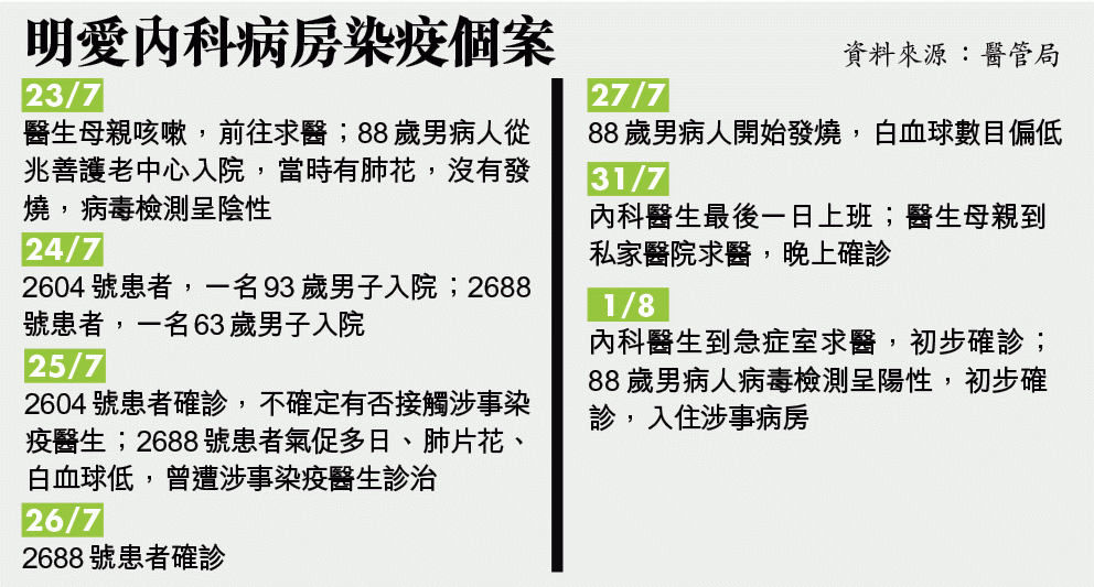涉事病房最早染疫的病人是93歲老翁,即第2604號病人,7月24日入院,翌日確診。同樣於24日入院的2688號個案為63歲男子,他翌日表示感氣促多日、肺片花、白血球低,曾遭涉事染疫醫生診治,翌日確診。