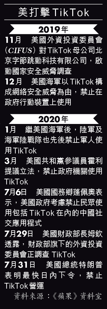 美國財政部長姆欽早前召開外資投資委員會,他昨透露:「我會說整個委員會都同意TikTok不能像現在一樣,將1億美國人民資料『送中』」他表明,TikTok只有兩個下場,一是被逼出售,一是禁止使用。美國國務卿蓬佩奧昨晚引述特朗普,指特朗普表明說「夠了」,他將在未來數天,將針對把資料送到中國的軟件公司有所行動,外界相信包括TikTok,但未知是否暗示不止對付TikTok一間公司。
