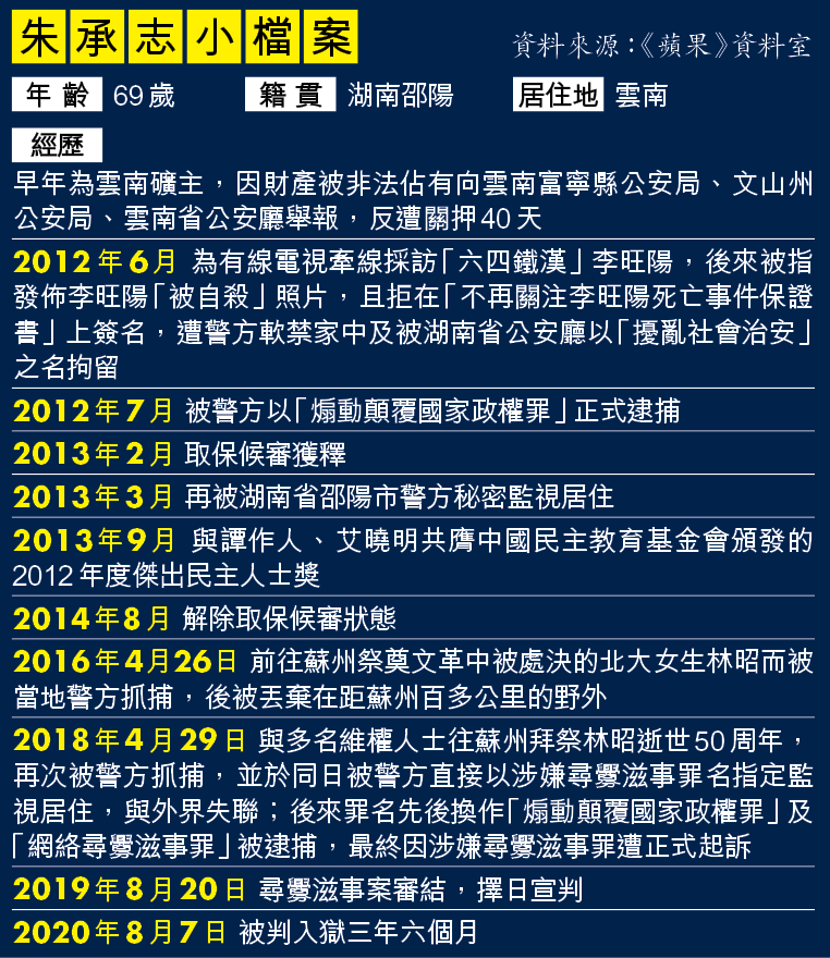 朱承志前年拜祭文革中被處決的北大女學生林昭後,被捕及被控尋釁滋事罪,案件去年已審結,但直到昨早才在蘇州的法院宣判。判決書指,朱承志2010年以來,通過fb和Twitter等境外平台,「大量散播嚴重損害國家形象、嚴重危害國家利益的訊息,起哄鬧事,混淆視聽,又長期詆毀中國法律制度,造成公共秩序嚴重混亂」,當局甚至對文章轉發數和點讚數作統計,「直接攻擊我國國家領導人和政治制度的虛假訊息達140餘條、累計被轉發700餘次、累計被點讚1,290餘次」。法院指,朱承志尋釁滋事罪名成立,判他入獄三年六個月。
